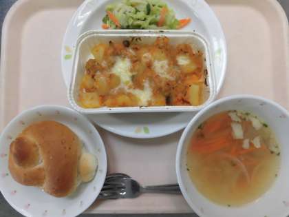 セサミパン・ポテトグラタン・コンソメスープ・フレンチサラダ