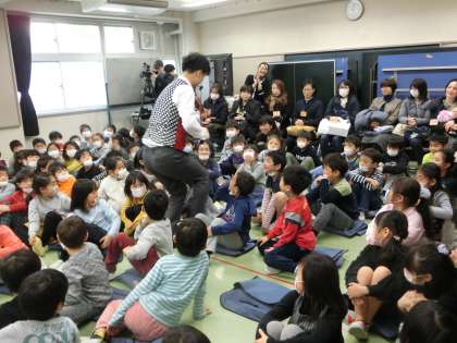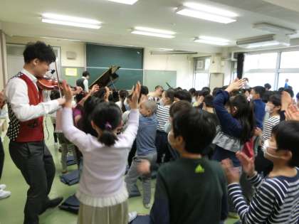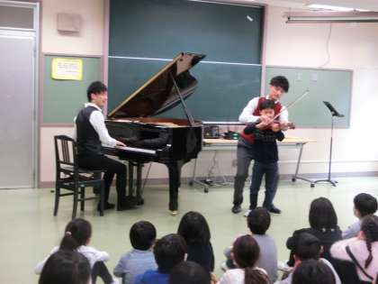 東京学芸大学卒業後プロの演奏家集団「エバリー」の中から2名の方が、1〜3年生に素晴らしい音楽を届けてくれました。体を使ってリズムをとったり、バイオリンとピアノが奏でる音を楽しみました。アンコールにみんなで校歌を熱唱しました。