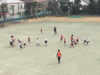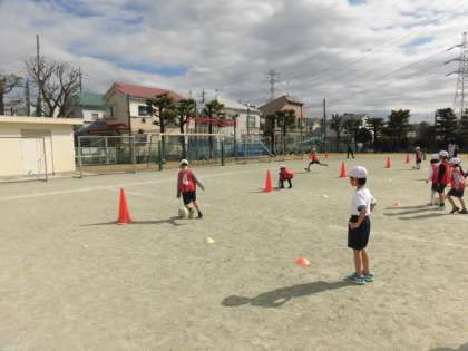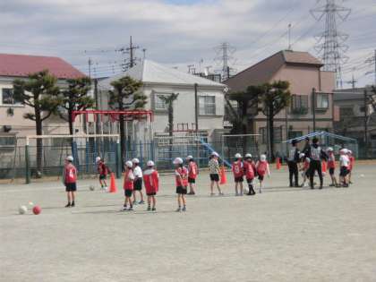 犬とふれあいの授業をした2年生。いっぺんに犬とはふれあえないので、2グループに分かれて、サッカーも教えていただきました。プロのサッカー選手が二人お見えになって楽しくサッカーを教えてくれました。