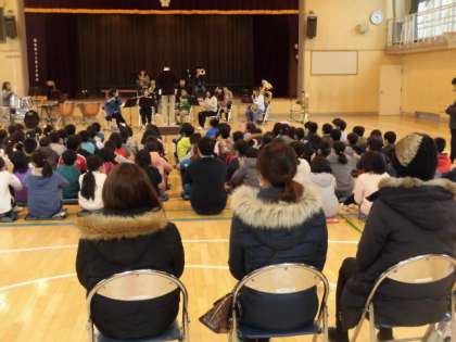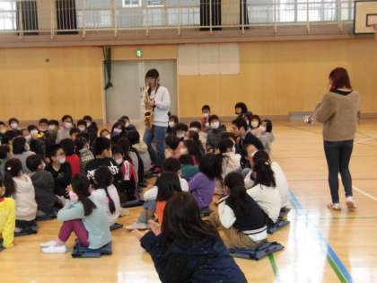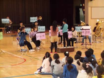 国士館大学の吹奏楽部の皆さんが3年生のために演奏会を開いてくれました。金管楽器や木管楽器等の紹介をしてくれたり、実際に指揮をさせてまらったり、お話にあわせた演奏をしてもらったり楽しいひと時を過ごしました。