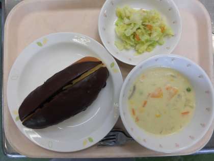 エクレアパン・コーンシチュー・キャベツサラダ・リンゴジュース