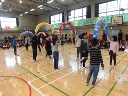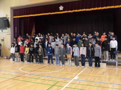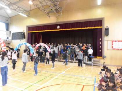 3月になりました。今日は、25日に卒業を迎える6年生に感謝の気持ちを表す「6年生を送る会」です。代表委員の進行で会がスタートしました。3年生の花のアーチの中を6年生が入場しました。