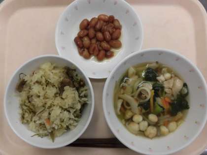 ぶた肉とごぼうのごはん・うずら豆煮・あんかけ汁