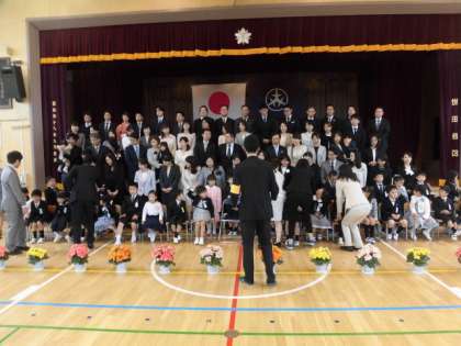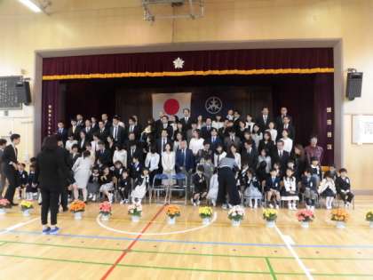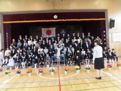 入学式が終わった後は、おうちの人と一緒に集合写真をとりました。何回も写真をとって少し疲れてしまったけれど、一度だけの小学校の入学式の思い出の1枚。よい笑顔で取れているでしょう。入学式が終わり、明日からは、たくさん覚えることがあります。今日は、ゆっくり休んで明日も元気に登校しましょう。