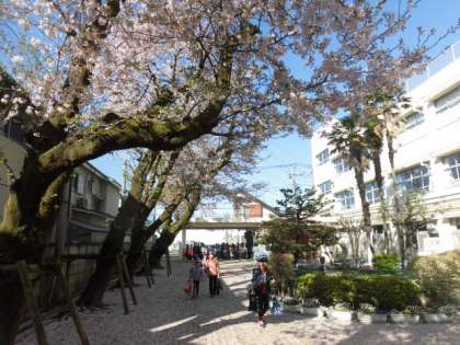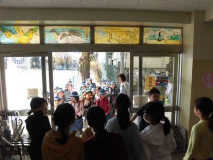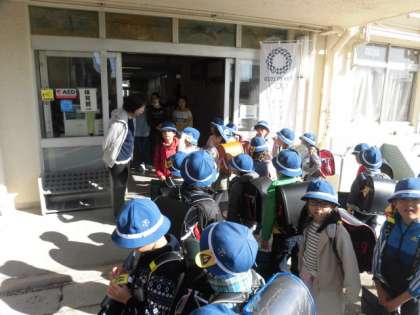 とてもよい天気の中、1年生が元気に登校してきました。玄関では、お世話をする6年生が待っています。自分で上履きに履き替えて、下履きを靴箱において教室に向かいます。