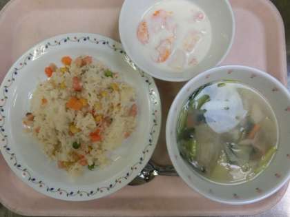 サケピラフ・ベーコンと野菜のスープ・フルーツヨーグルト