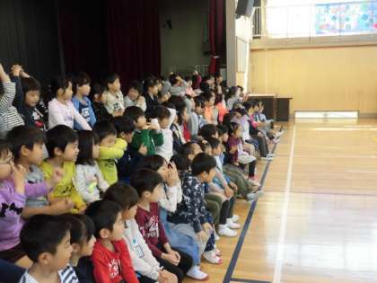 1学期最初の土曜授業日。1校時は、1年生を迎える会を行いました。月曜日の入学式から6日間、元気に登校した1年生。入学式と同じように、6年生と手をつないでの入場です。1週間お世話をしてくれた6年生、入学式より親しくなったことが、入場の様子からわかります。