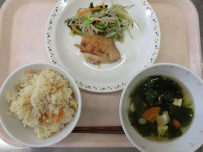 たけのこごはん・とり肉の照り焼き・青菜のおひたし・すまし汁