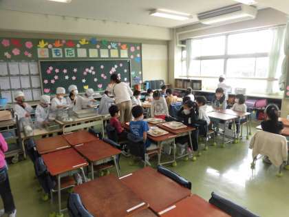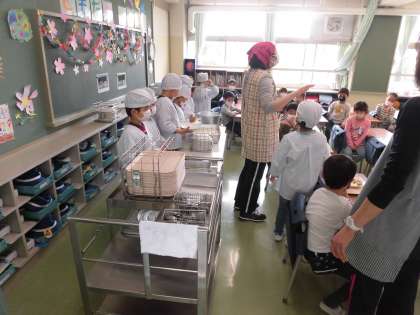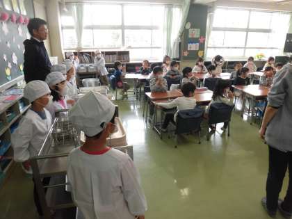 17日から、1年生の給食が始まりました。当番の子どもが白衣を着て配膳をがんばっています。先生の指示をしっかりと聞いて、給食の手順を覚えて、楽しく給食を食べましょう。