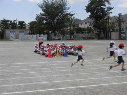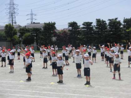 2年生は、校庭でダンスを踊る場所を確認しています。1年生は、かけっこの練習。手を大きく振ってまっすぐ走っています。