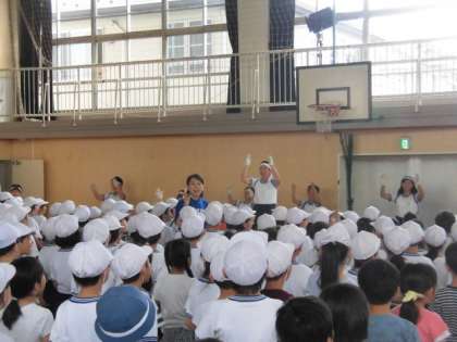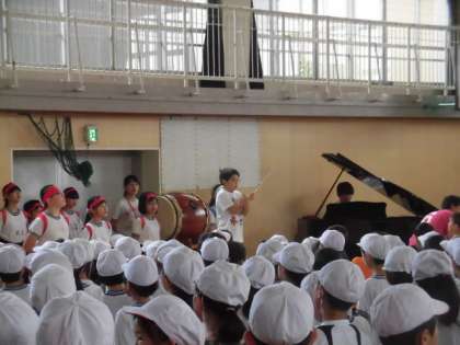 今日の音楽集会は、運動会の歌や応援歌の練習です。赤白に分かれて並んだ体育館に元気な歌声が響き渡りました。