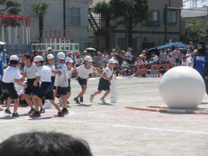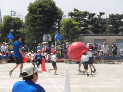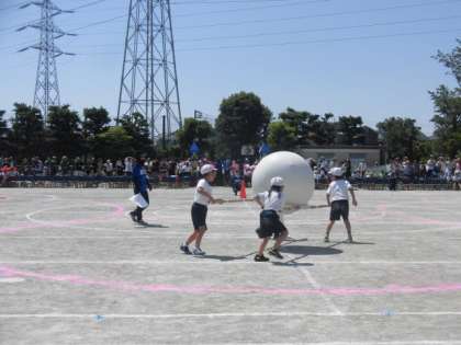 プログラム4番、2年生のわっしょい令輪(和)です。4人で大玉を神輿のように運ぶ競技です。大玉を落とさないように慎重に、そのうえでスピードを出すには協力が必要です。4人で「れいわ」と言ってから次のグループにバトンタッチです。