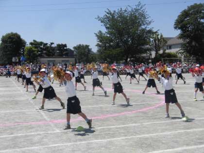 プログラム5番、1年生の演技「マスカット」です。キラキラ光るボンボンをつけて、マスカットの曲に合わせて楽しく踊る姿に「かわいい」という声が来賓席から聞こえてきます。たくさん練習した成果をしっかりと発揮していました。