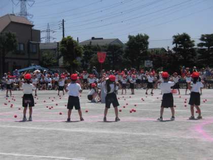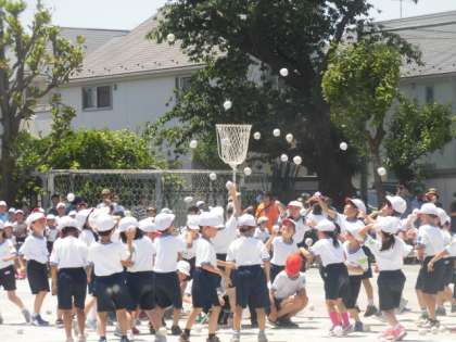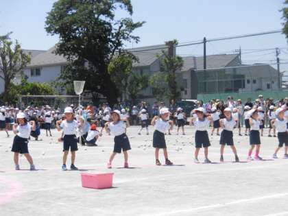 プログラム10番、1年生の競技「チェッコリ玉入れ」です。武蔵丘小学校の1年生は、毎年このダンスを踊って玉入れをしています。今年もかわいい1年生のダンスとちょっと大きくなった子どもたちのダンスも見られました。ダンスだけでなく、玉入れも一生懸命に取り組みました。