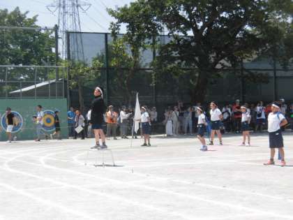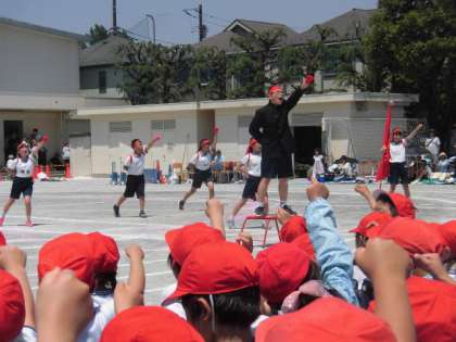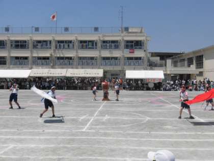 プログラム14番、午後の最初の種目「みんなで応援」です。午後の応援は、児童席で行います。紅も白も負けないようにと大きな声を出しています。午後の競技も最後まで頑張って取り組みましょう。