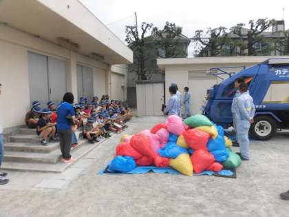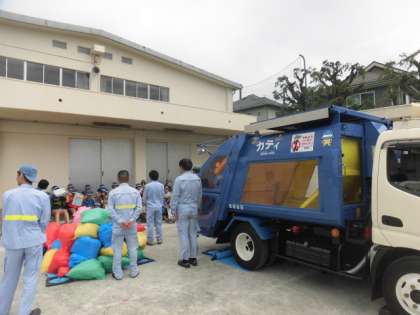 社会科で「ごみの処理」について学習している4年生。今日は砧清掃事務所から職員の方に来ていただき出前授業をお行いました。二グループに分かれて、ごみ処理の仕方についてお話を聞いたり、透明で中の見えるごみ収集車(カティー)に実際にごみ袋を入れて収集の体験をしたりしました。みんなしっかりと話を聞いて、たくさんメモを取っていました。体験をもとに学習をさらに深めていきましょう。