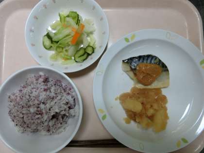 ゆかりごはん・魚のピリ辛ソースかけ・じゃがいもの甘辛煮・野菜の甘酢あえ