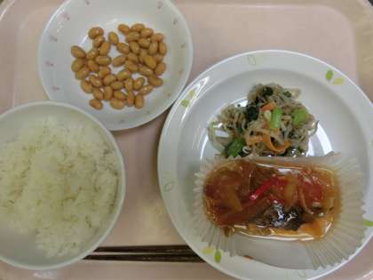 ごはん・魚の甘酢あんかけ・野菜のごま味噌和え・ぶどう豆