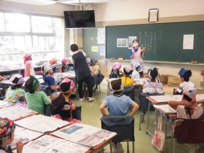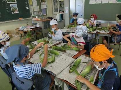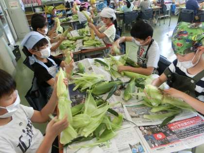 3年生が、給食ででるとうもろこしの皮むきに挑戦。栄養士の石塚先生の話を聞いた後、一枚一枚丁寧に皮をむいて、つぶの分だけあるひげをしっかりと取りました。たくさんのとうもろこしがあっという間にむき終わりました。みんなでむいたとうもろこしは給食でおいしくいただきました。