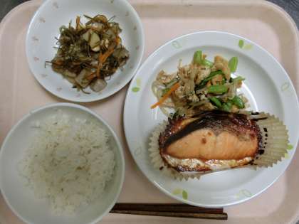 ごはん・魚の味噌マヨネーズ焼き・おひたし・きざみ昆布の五目煮