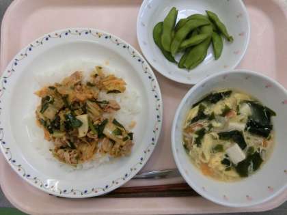 豚キムチどん・たまごとわかめのスープ・えだまめ