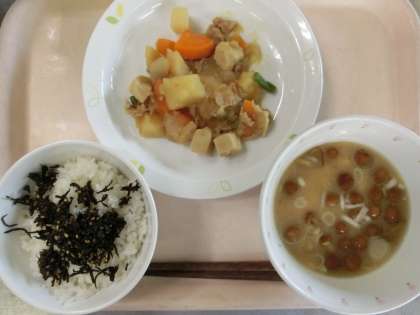 ごはん・ひじきのふりかけ・肉じゃがうま煮・なめこ汁