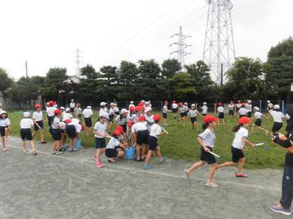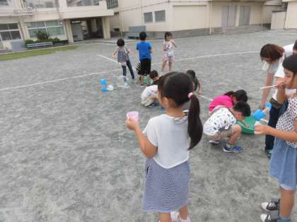 一学期最後の、土曜授業。1年生は、生活科でシャボン玉遊びを、4年生は理科の空気と水の実験で使った水鉄砲でお楽しみ遊びをしています。夏らしい天気ではありませんでしたが、どちらも楽しく取り組んでいました。