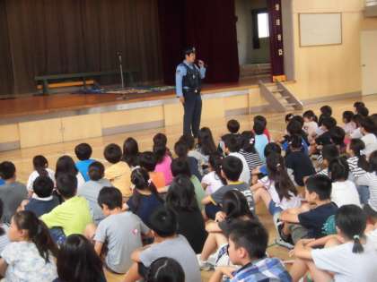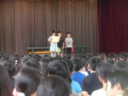 体育館で1学期の終業式を行いました。蒸し暑い中での始業式でしたが、みんな集中して校長の話を聞いていました。3年生の代表の3人が、1学期にがんばったことの発表をしてくれました。中学年になって初めて取り組んだことの多い3年生。さまざまがんばった様子が伝わる発表でした。式の後には、松葉通りの駐在の高橋さんから、いつもと違ってわくわくしてしまう夏休みだからこそ、しっかりと交通ルールを守って事故にあわないようにすることが大事だというお話をしていただきました。安全で楽しい夏休みにしていきましょう。