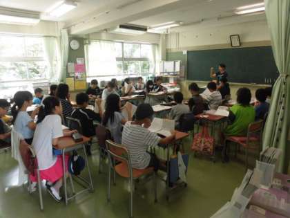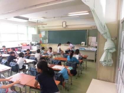 大掃除の終わった教室では、先生から1学期の通知表をいただいています。がんばったこと、努力したことなどお話を聞いて渡してもらいました。1学期の頑張りを2学期につなげていけるようにしましょう。2学期の前の44日間の夏休みも楽しく過ごしてください。