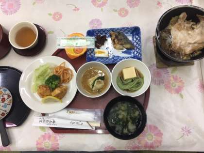 梅屋敷旅館での、最初の夕食です。献立は、ごはん、わかめ汁、豚すき焼き、鶏の唐揚げ、スパゲッティナポリタン、温キャベツ、ブロッコリー、白身魚西京焼、みかん牛乳寒、湯波の佃煮、煮物、玉子豆腐、茶そうめん、みかんゼリーです。しっかり食べましょう。いただきます。