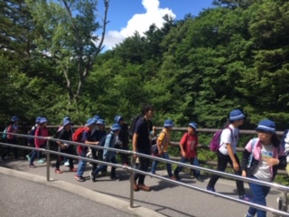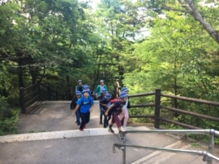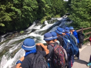 竜頭ノ滝下から、ハイキングを始めます。天気は良くなってきて、ハイキング日和になりました。みんなで元気に歩きましょう。