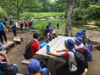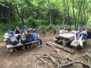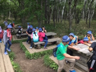 青木橋で休憩中。湯滝までは、後少しです。頑張りましょう。