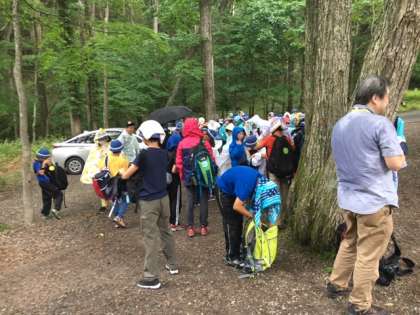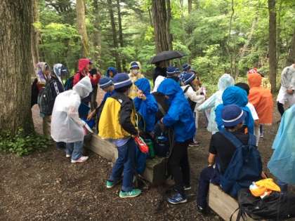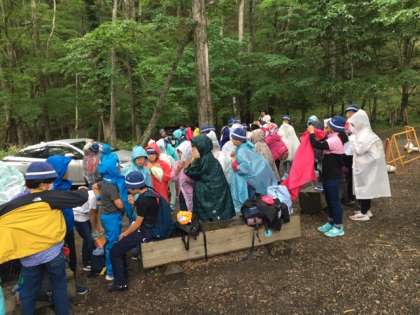 湯滝の駐車場に到着。山の天気は変わりやすく、急に雨が降りだしました。バスに迎えに来てもらいます。