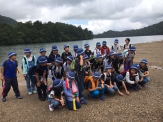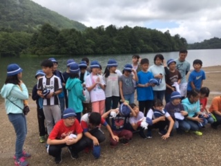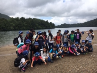 バスに乗って湯の湖に到着。湯の湖をバックに写真撮影です。