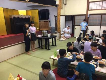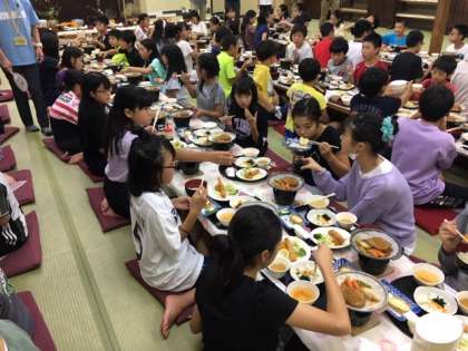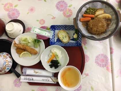 梅屋敷旅館でいただく二回めの夕食です。女将さんにいつも料理の説明をしていただき、ミニ女将にかわいくおかわりの手伝いをしてもらっています。今日の夕食もしっかり食べましょう。献立は、ごはん、和風ハンバーグ、エビフライ、温キャベツ、ほたて風味フライ、サラダ、グラタン、アスパラ、コンソメスープ、ぶどうゼリーです。いただきます。