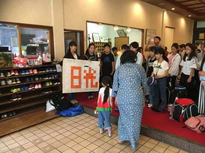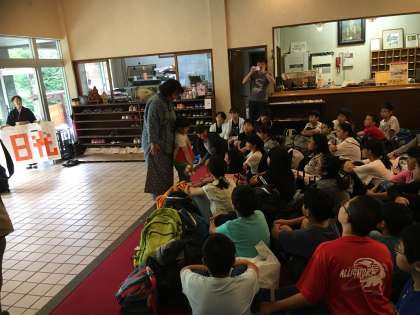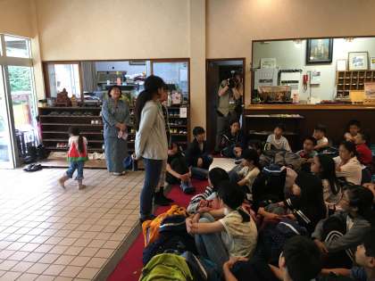 ロビーで閉園式を行っています。3日間の梅屋敷旅館での生活、楽しい思い出ができました。感謝の気持ちをもって式を行いましょう。