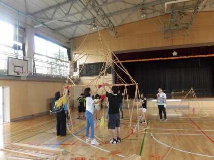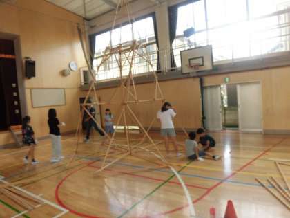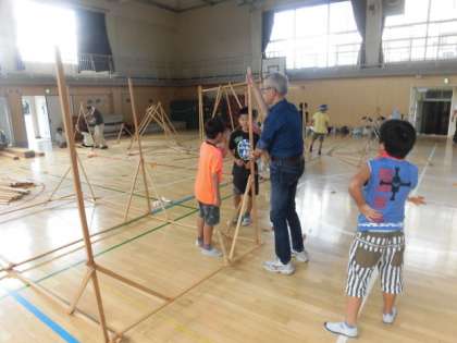 木材を輪ゴムでつないで、どんどん高く、広く組み立てられています。大人も協力しています。
