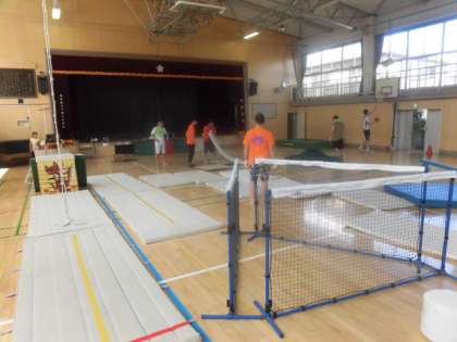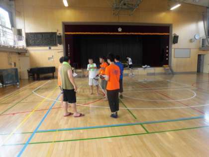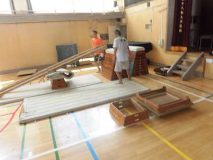 体育館でおやじの会のみなさんが明日の「MUSASHI」の準備をしてくれています。どんなコース化は明日のお楽しみです。明日参加する人は、しっかりと準備運動をして、説明をよく聞いて安全に取り組みましょう。3、4年生は、9:00から、5、6年生は10:30からです。遅れないようにしましょう。