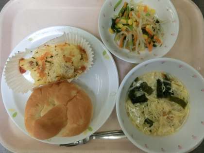 パインパン・ポテトクリーム焼き・小松菜とコーンのソテー・たまごとわかめのスープ
