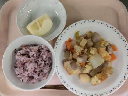 黒米ごはん・ぶた肉と大根のうま煮・りんご