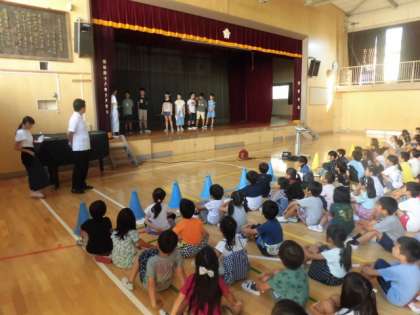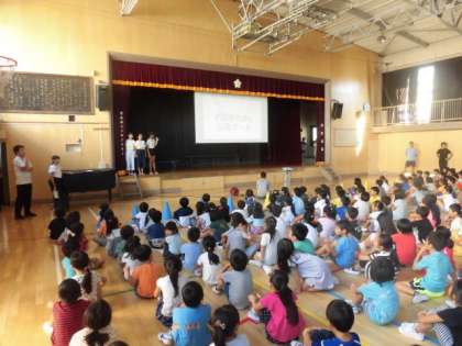 2学期最初のゲーム集会を体育館でしました。口を開けないでしゃべっての伝言ゲームです。短い言葉もうまく伝えることが難しかったです。少し蒸し暑い体育館でしたが、みんなで楽しく伝言ゲームをしました。