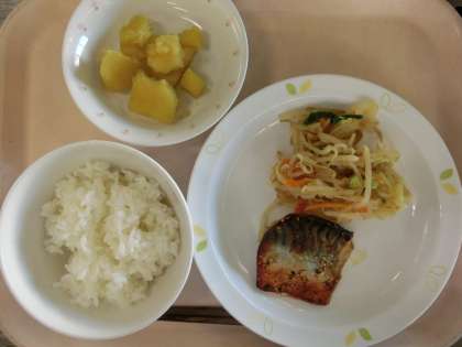 ごはん・魚の七味焼き・さつまいもの含め煮・野菜の辛子しょうゆ和え
