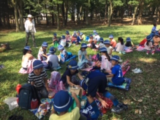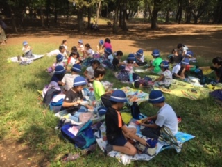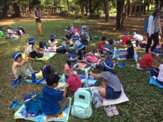 待ちに待ったお弁当です。いつもより早い時間の昼食ですが、朝からたくさん歩いて、たくさん遊んで、お腹はぺこぺこです。みんなで楽しく、お弁当を食べましょう。お弁当ね準備ありがとうございました。感謝をしていただきます。