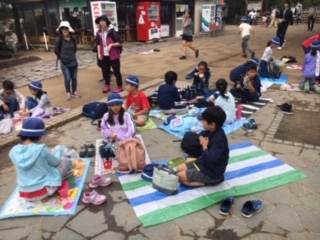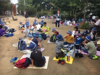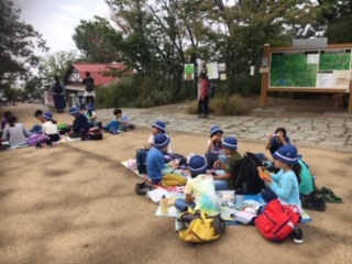 頂上でお弁当を食べています。34年で仲良く話をしながら食べましょう。いただきます。