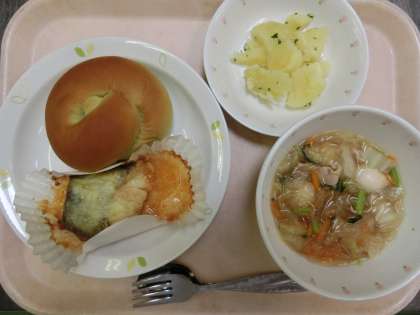 あしたばパン・魚のチーズ焼き・パセリポテト・白菜と春雨のスープ