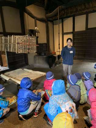 治太夫堀公園の民家園に到着しました。安藤家の中で養蚕について学んでます。