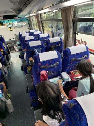 小雨が降ってるので、バスの中でお弁当。みんな、おいしいに食べています。