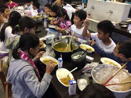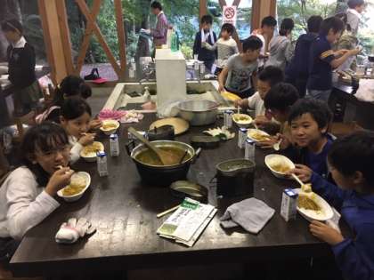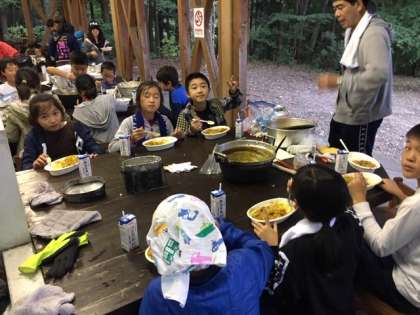 無事にカレーライスも完成。みんなで頑張って作ったカレーライスは、格別です。みんな笑顔でいただいています。