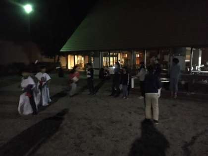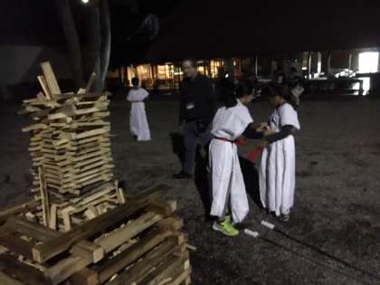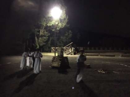 キャンプファイヤー係が準備をしています。良い天気のなか、楽しいひと時が過ごせそうです。