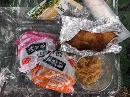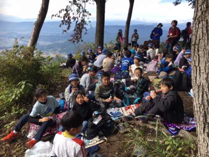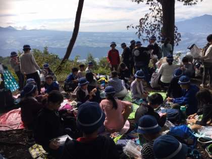 頂上でお弁当を食べます。たくさん歩いてお腹がペコペコです。今日のお弁当は、おにぎり2こ、白身魚の竜田揚げ、たくあん漬け、切り干し大根です。みんなで楽しくいただきます。